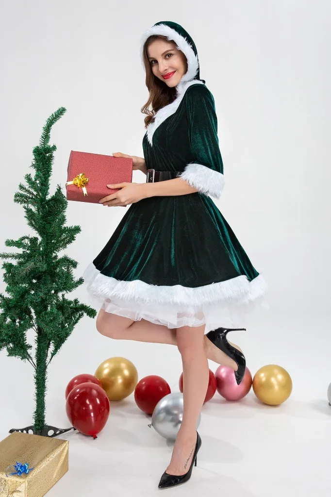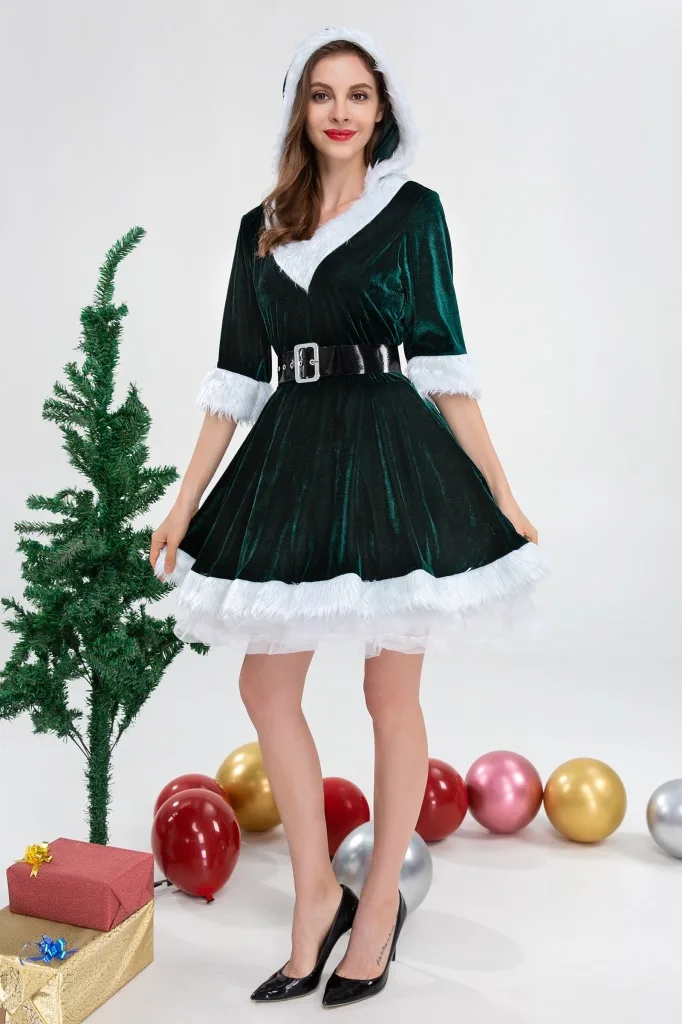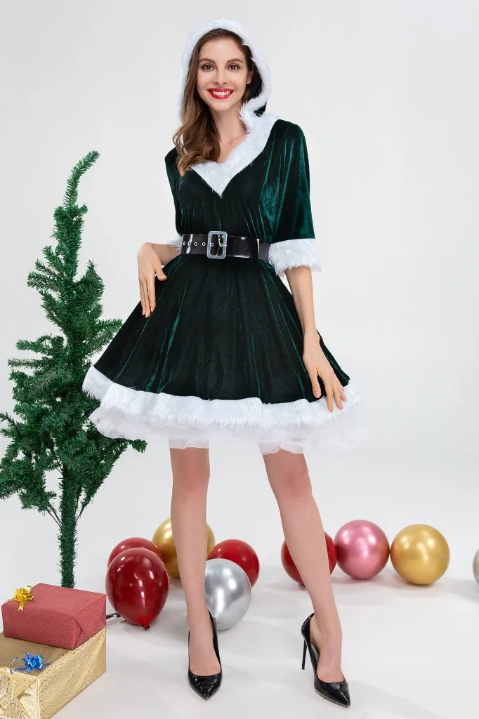 Formal Women Christmas Fancy Dress Xmas Party Fur Tulle Tutu Dress Female High Waist Belt Dress V-Neck Hooded Ball Gown