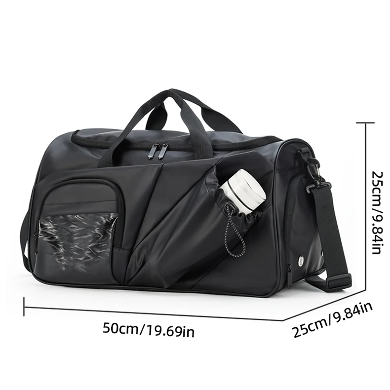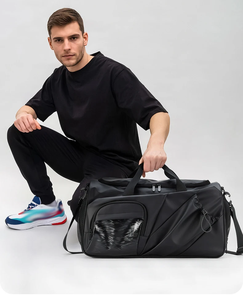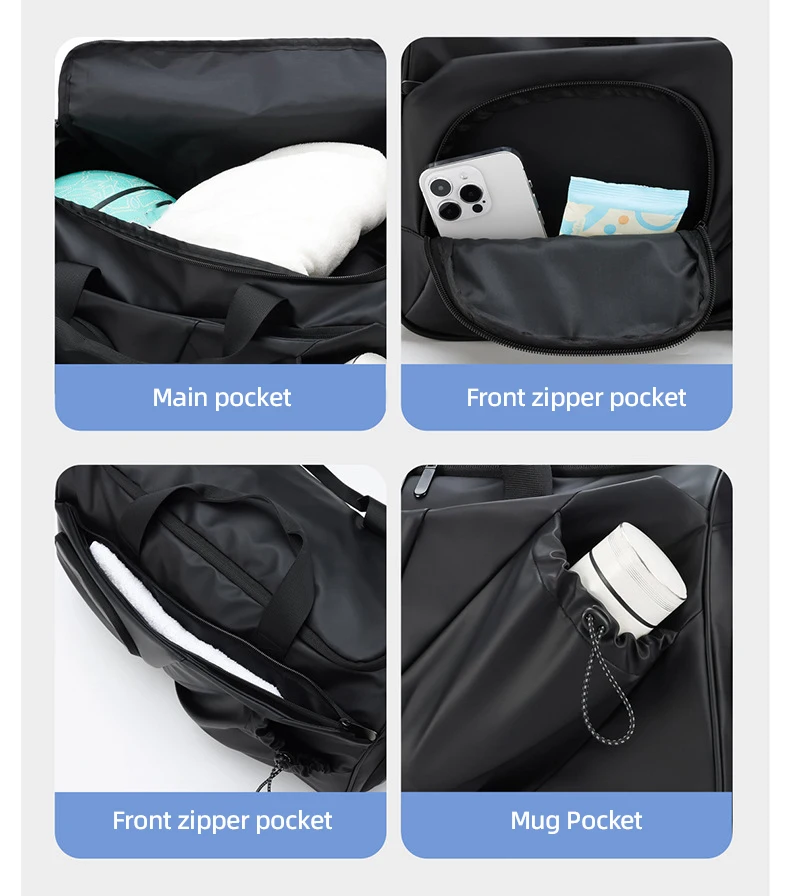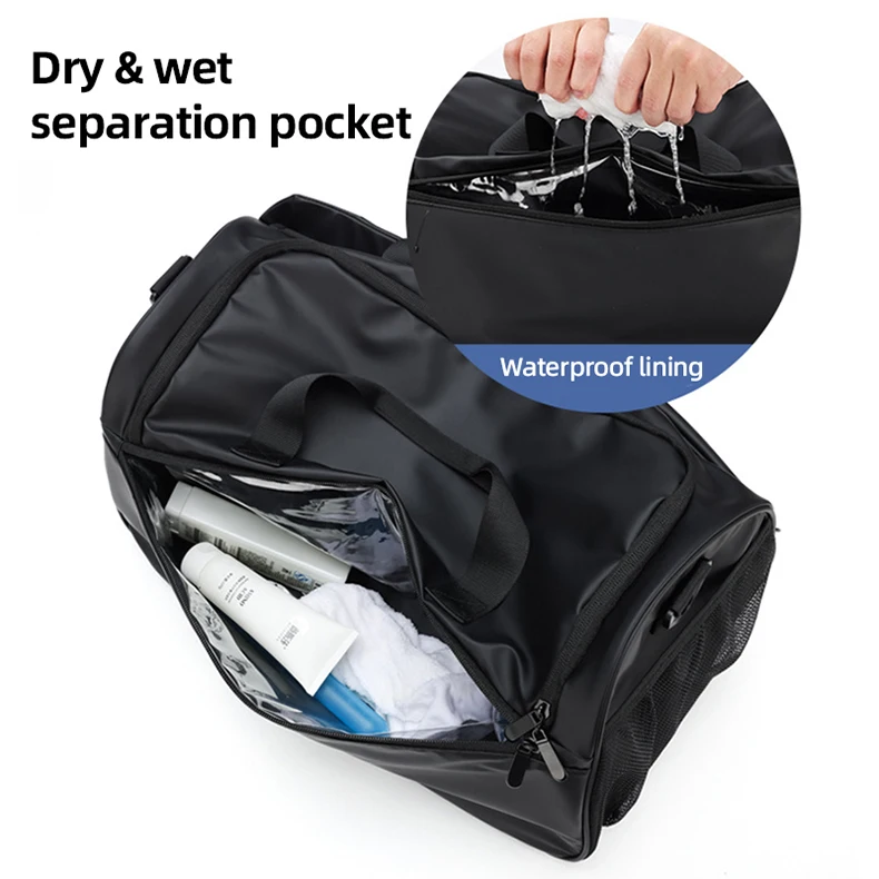 1. Large-capacity main pocket setup, built-in wet/dry separator pocket, side mesh pockets setup in the bag body, multiple zip secondary pockets, separate shoe compartment and water bottle insert pocket. Partition storage, easy access
