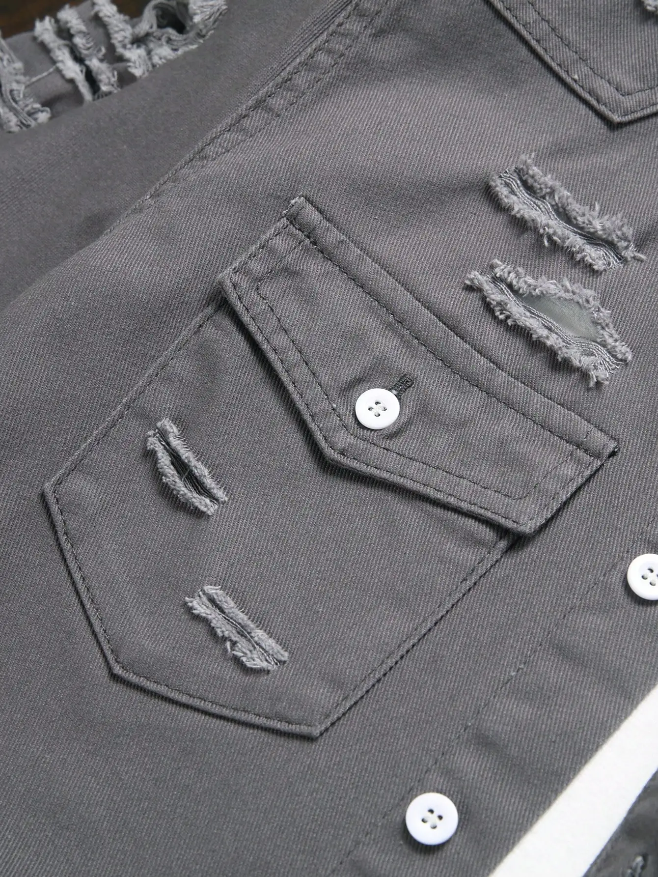 Men's Summer Dark Gray Ripped Short-Sleeve Denim Shirt, featuring a lapel collar and double pockets to retain the workwear style