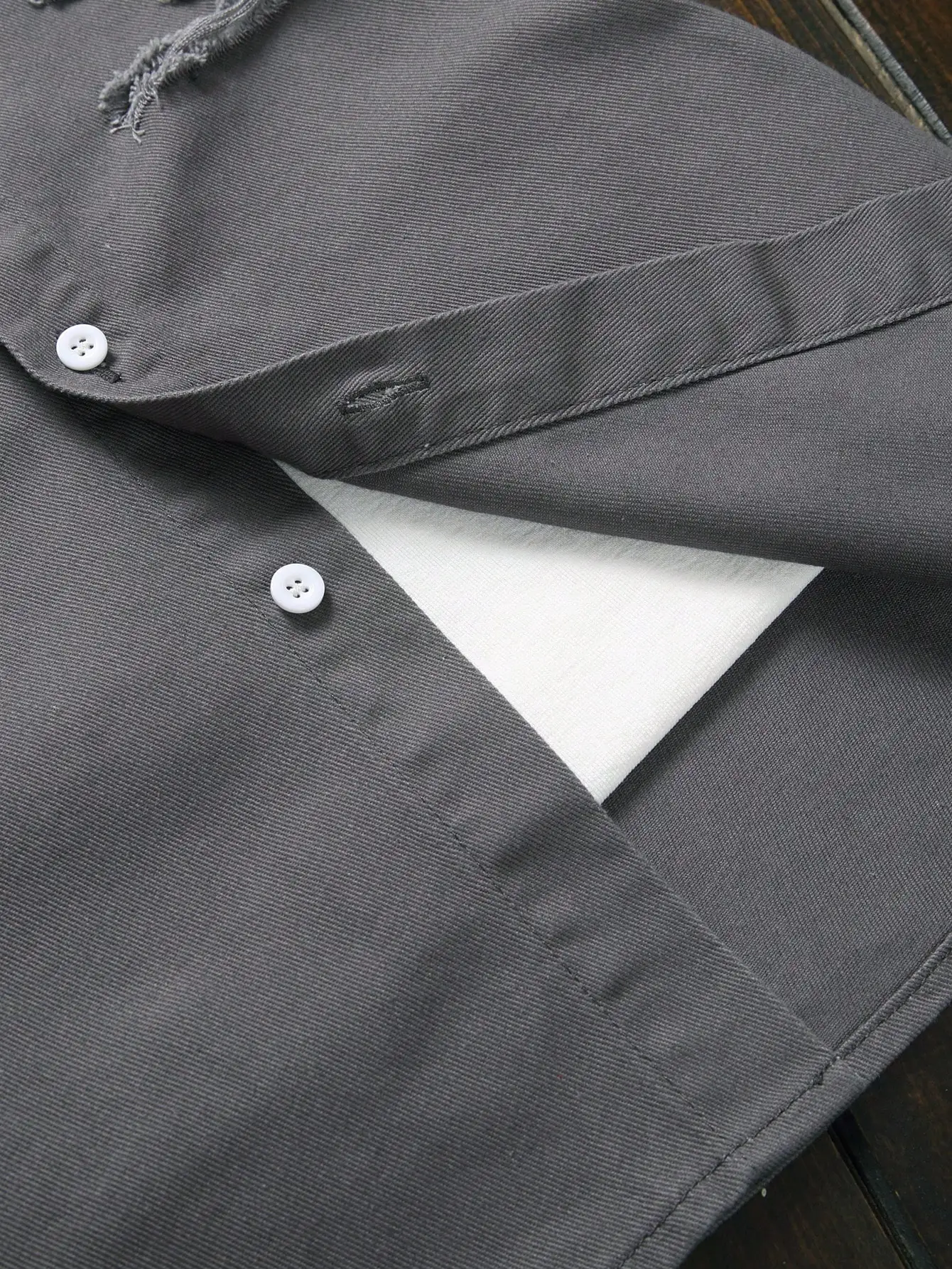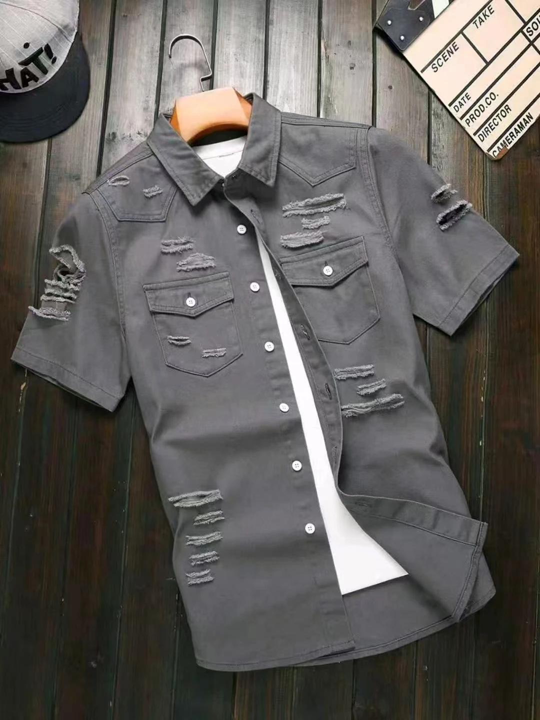 Men's summer dark gray denim short-sleeve shirt, with a ripped design that inherently exudes an unruly vibe. Crafted from tough denim fabric, it boasts a crisp and shapely look. The lapel collar, double pockets, and neat buttons retain the workwear style, and layering it over a white T-shirt adds more depth. Blending street style with a retro feel, it effortlessly creates a casual and cool trendy look, making it an eye-catching piece whether for daily outings or citywalks.