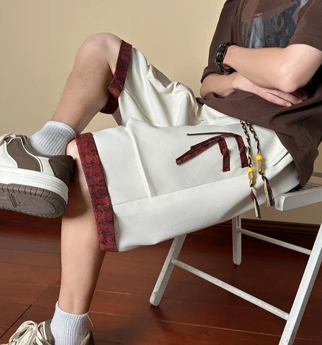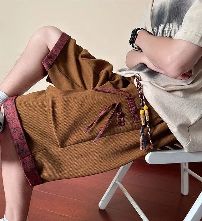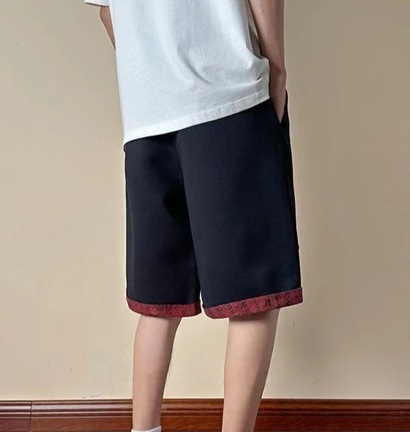 With Pockets Draw String Long Men's Cargo Shorts Button Elastic Waist Baggy Black Loose Bermuda Half Male Short Pants Wide Nylon